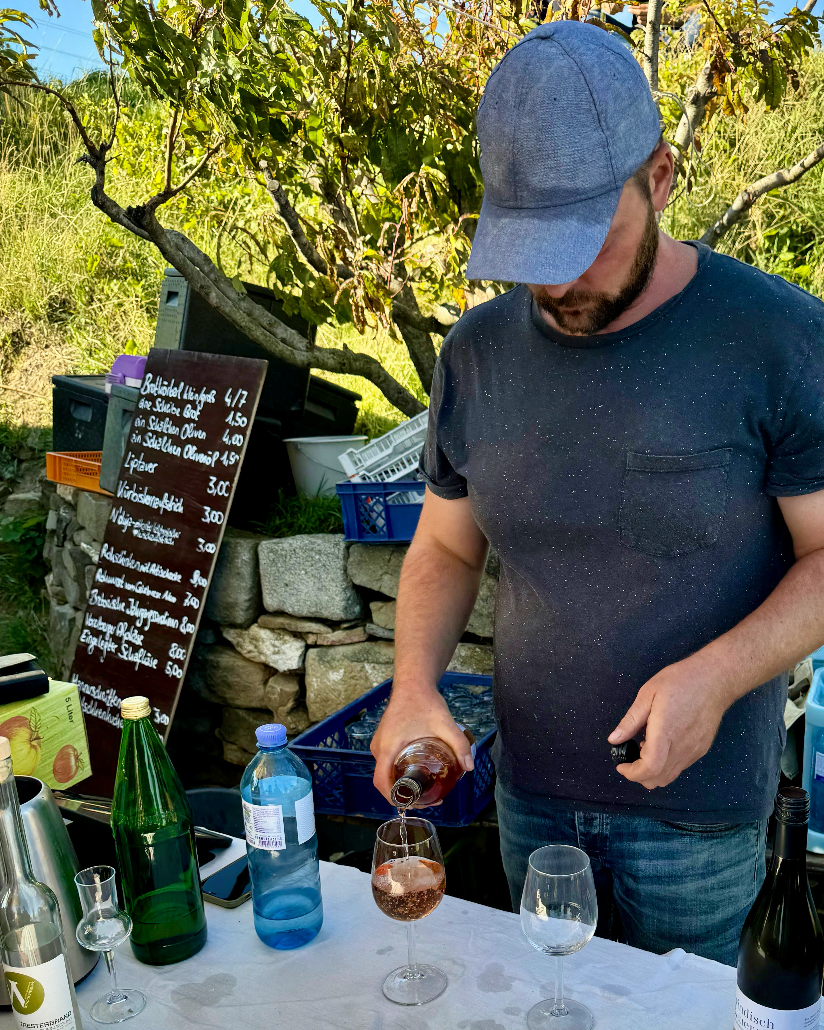 In the afternoon, we took a trolley out to the vineyards growing on the city's northern hillsides. Vienna is the only capital with significant wine growing inside its city limits, fitting for the Austrian's own name for the city, "Wien". On sunny weekends, the Heurigers open up their hillside wine huts among the vines. Starting at the road beside the Nussdorf Cemetary, we began our hike up the steep hillside of the Nussberg where the Battle of Vienna began in 1683, ending the Ottoman Turks siege of the city. We passed a wine hut halfway up, but we continued on until we reached Weinbau Windischbauer near the top. Purchasing two glasses of wine, we sat among the vines with awesome views of the Danube River and the city below. Nearly all Vienna winegrowers produce the traditional Gemischter Satz (field blend), in which different grape varieties are grown together in the same vineyard, harvested at the same time and turned into a single wine.